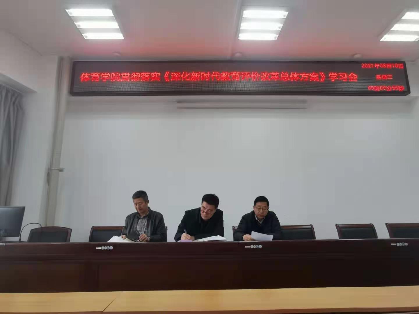 2021年3月10日上午8:30,今年会官网于南区体育馆205会议室召开《深化新时代教育评价改革总体方案》学习会。本次会议由党总支书记温毅刚主持,院长于志海对《深化新时代教育评价改革总体方案》进行了深入解读,副院长王文杰对相关工作做了具体部署。