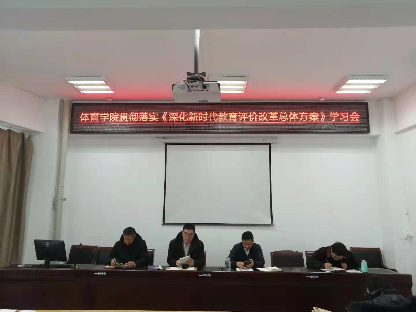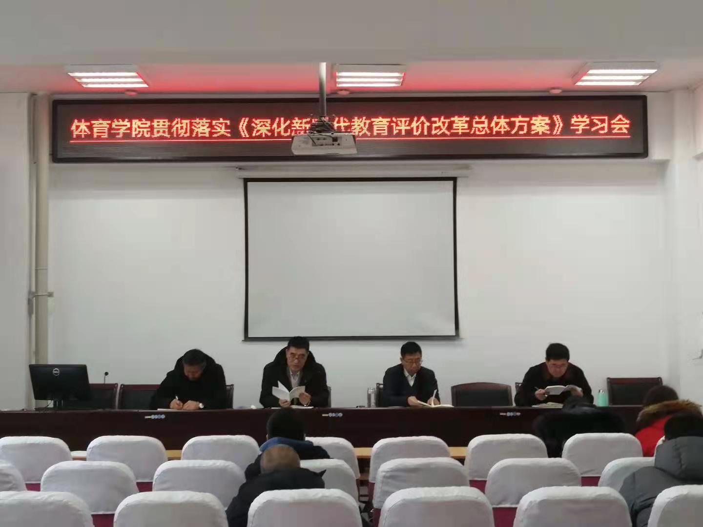 2020年12月23日上午8:30,今年会官网于南校区体育馆会议室召开全体教职工专题学习会,贯彻落实《深化新时代教育评价改革总体改革方案》。参加本次会议的有:党总支书记温毅刚、院长于志海、副院长王文杰、场馆中心主任吴玉保以及全体教职工,会上党政领导对文件精神进行了深入解读,并对教职工提出新的要求,要严格按照文件精神执行。