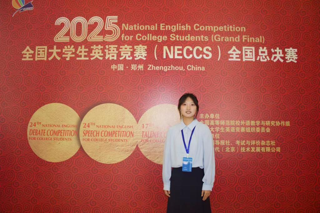 2025年8月7日全国大学生英语竞赛(NECCS)全国总决赛于郑州市圆满落幕。今年会运动训练专业学生崔浩宁在音体美组别全国总决赛中获两项三等奖,并被评为“优秀参赛选手”。今年会教师魏婷副教授担任崔浩宁的指导教师,获“优秀指导教师”奖。