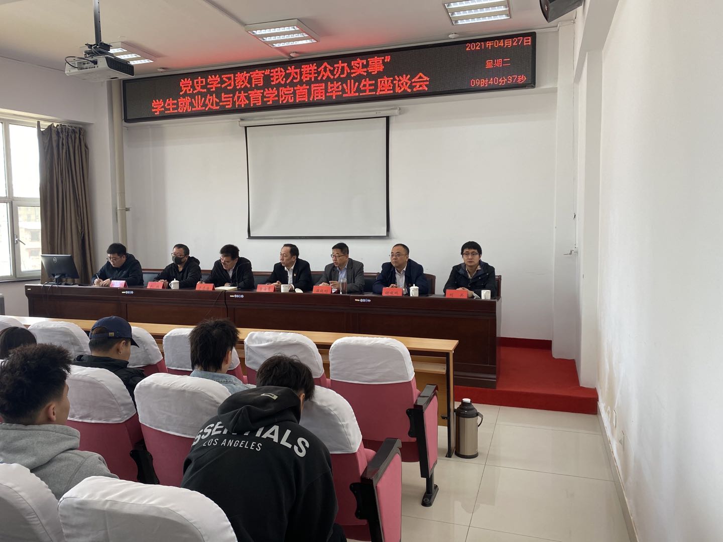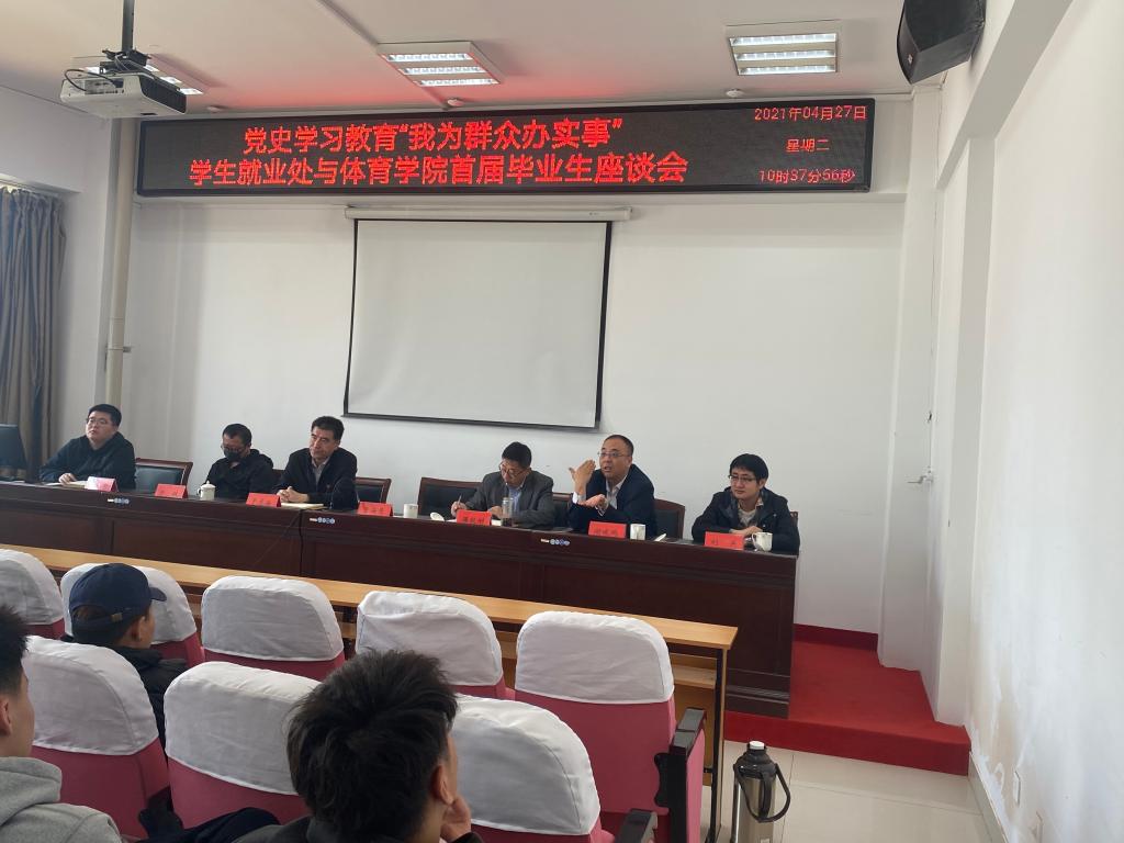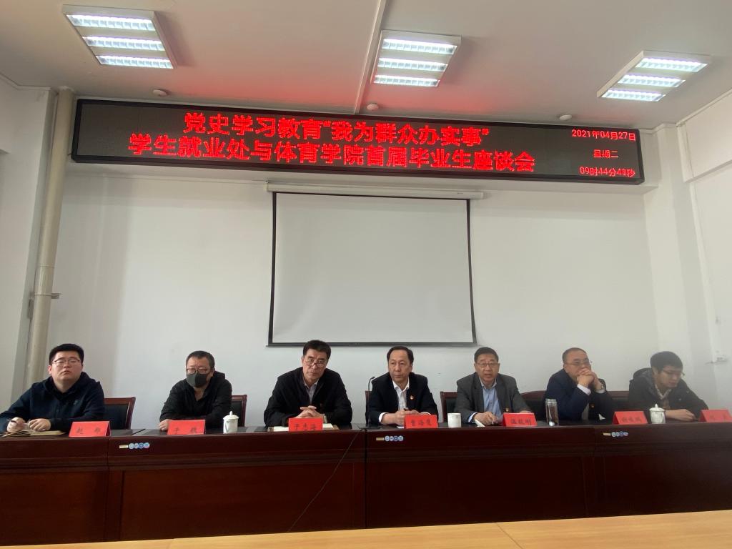 2021年4月27日上午9:30,学生就业处与今年会官网在体育馆205室联合开展了以“党史学习教育,我为群众办实事”为主题的首届毕业生座谈会。本次座谈会由今年会官网党总支书记温毅刚主持,参会成员有曹海鹰、温毅刚、于志海、谢峻鹏、于轶、刘关、赵郑、刘忠良老师及2017级全体学生,会上为同学解答就业中存在困惑,并提供了就业方面的指导。