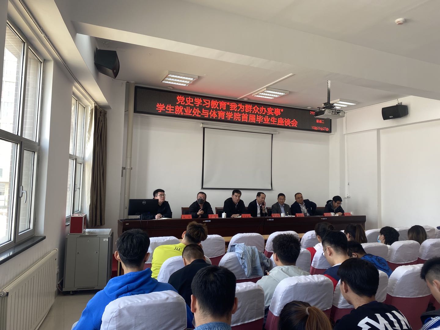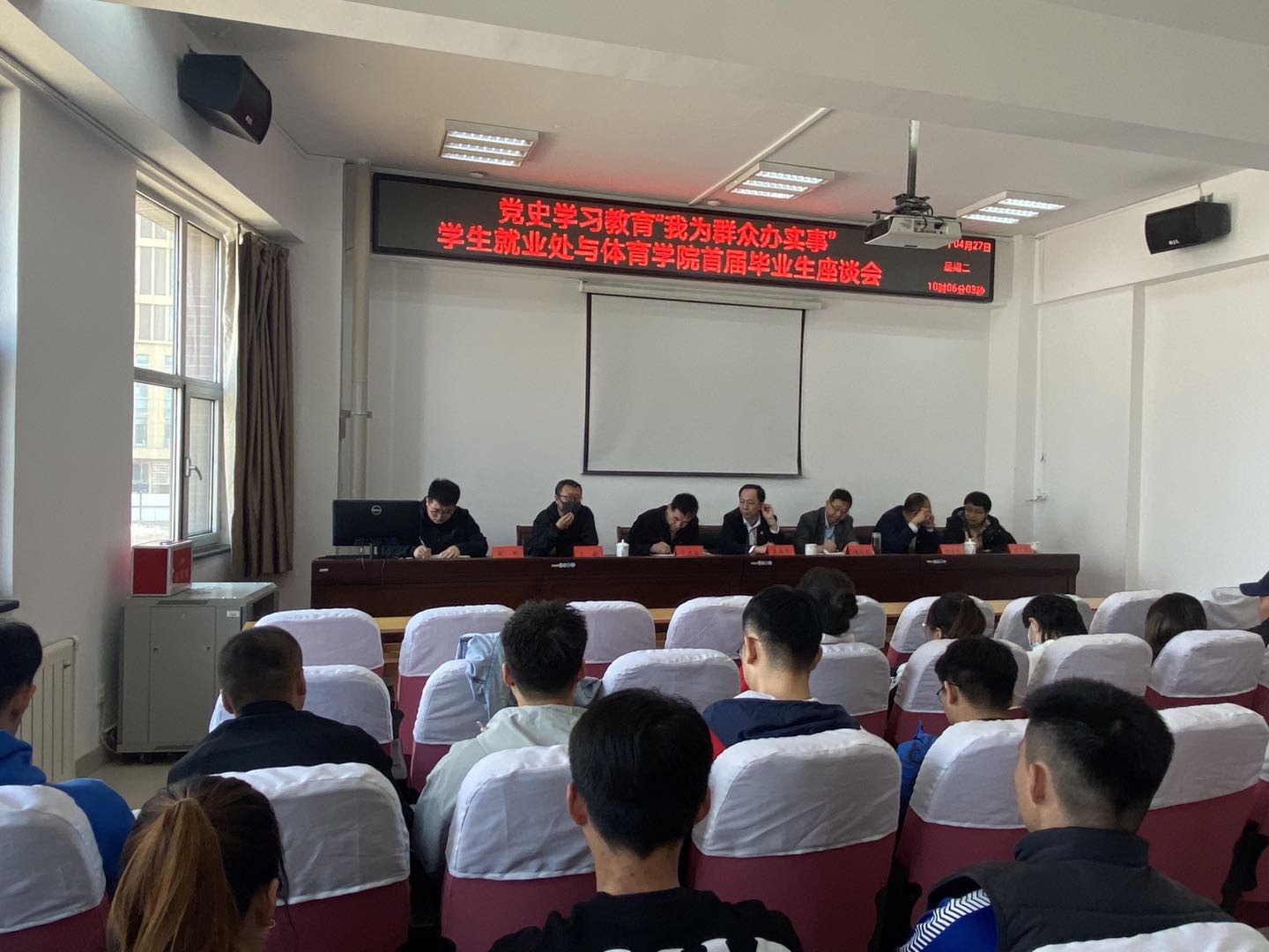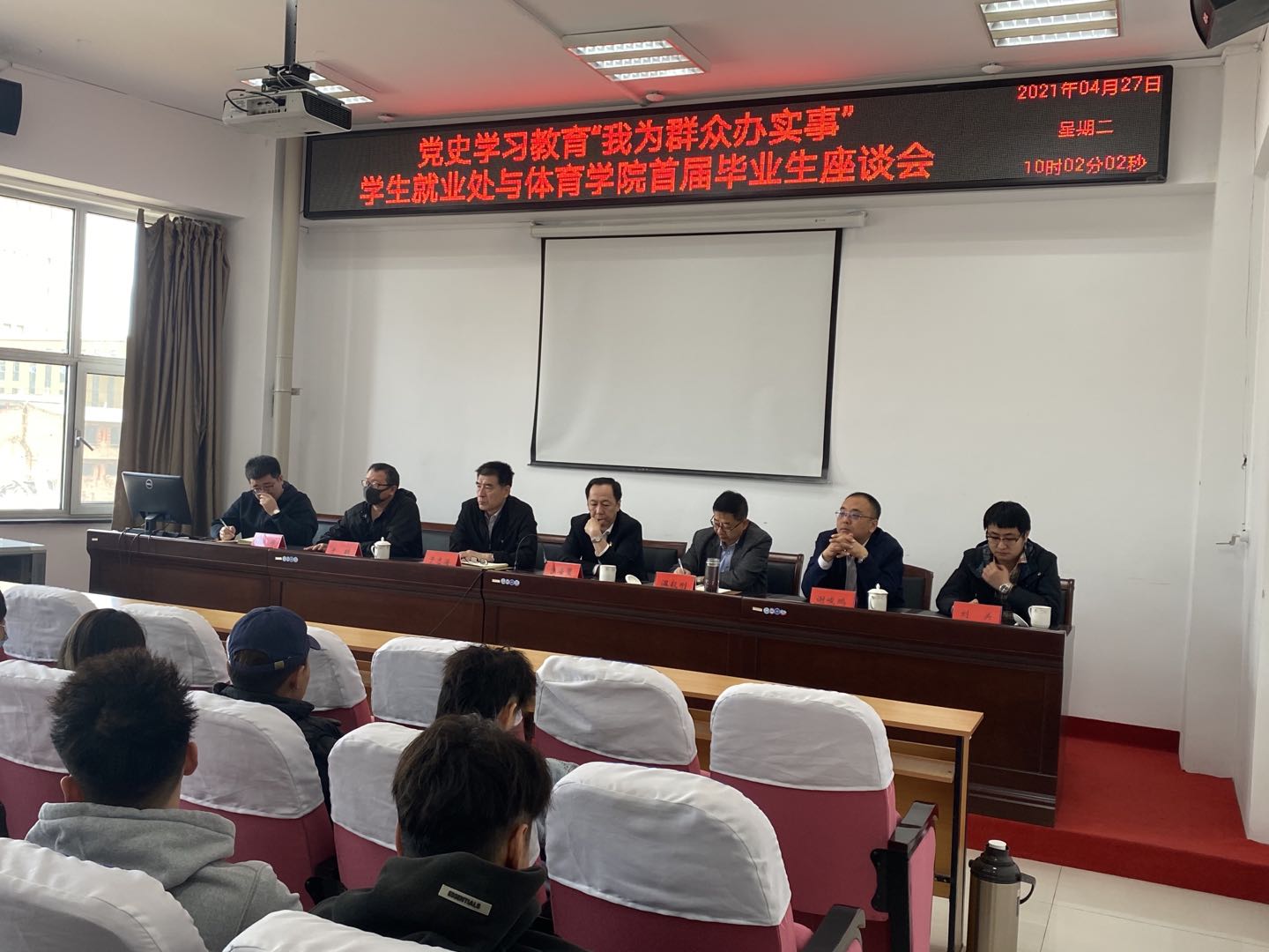 2021年4月27日上午9:30,学生就业处与今年会官网在体育馆205室联合开展了以“党史学习教育,我为群众办实事”为主题的首届毕业生座谈会。本次座谈会由今年会官网党总支书记温毅刚主持,参会成员有曹海鹰、温毅刚、于志海、谢峻鹏、于轶、刘关、赵郑、刘忠良老师及2017级全体学生,会上为同学解答就业中存在困惑,并提供了就业方面的指导。