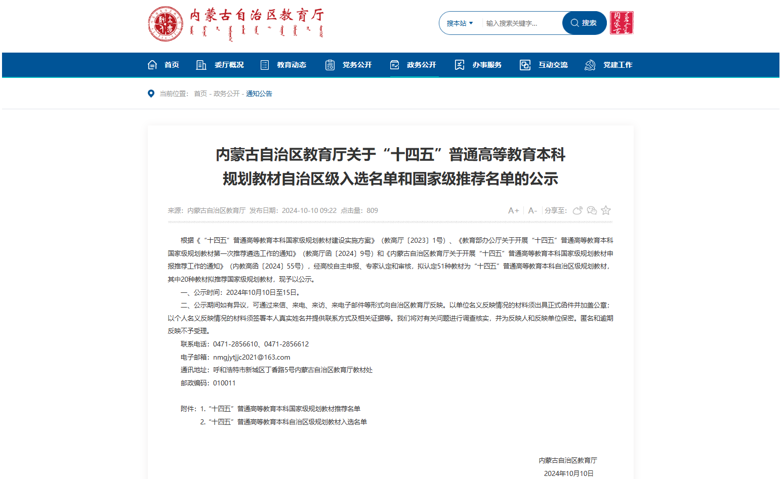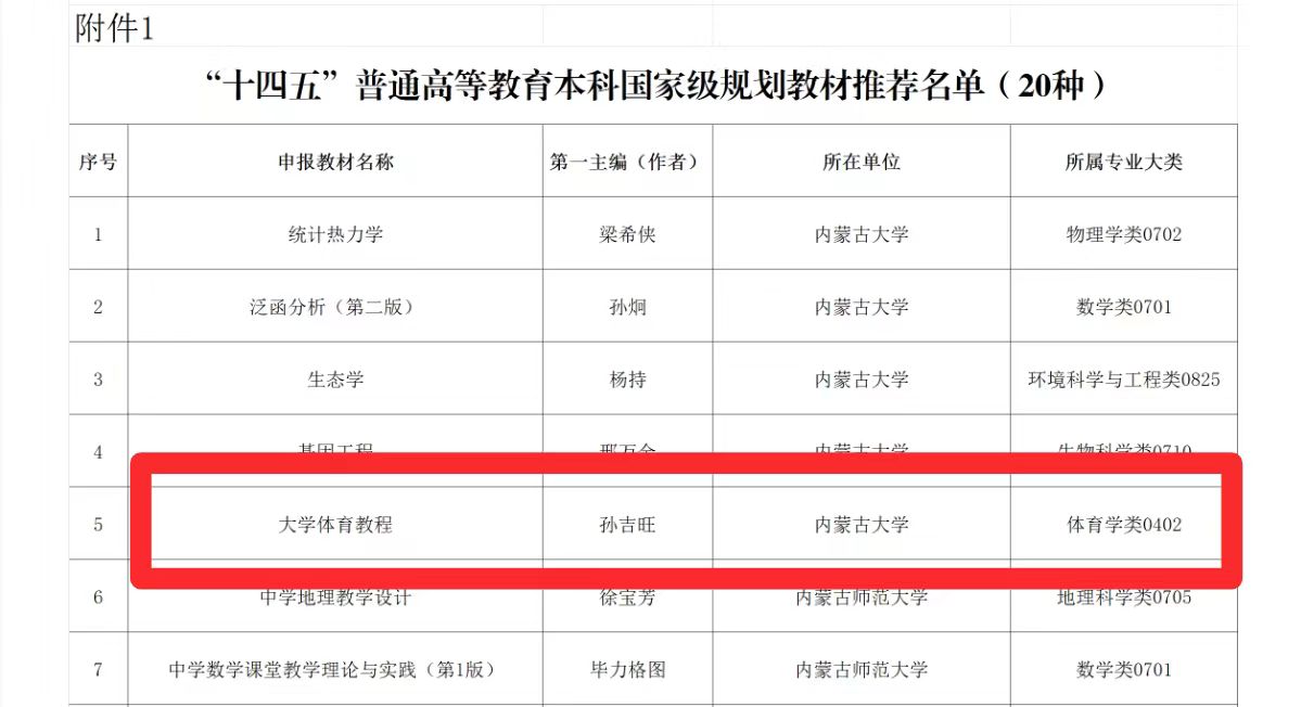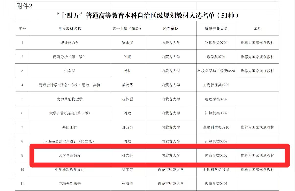 2024年10月,内蒙古自治区教育厅发布了“十四五”普通高等教育自治区级规划教材和国家级推荐名单。今年会孙吉旺副教授主编的教材《大学体育教程》成功入选“十四五”普通高等教育本科自治区级规划教材。该教材由自治区教育厅推荐进入“十四五”普通高等教育本科国家级规划教材评选。