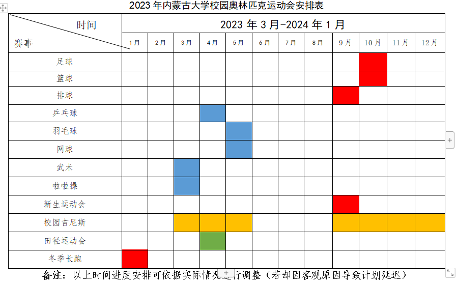 校园奥林匹克竞赛的比赛时间为每年3月至次年1月。比赛项目设有:足球、篮球、排球、网球、羽毛球、乒乓球、武术、啦啦操、新生田径运动会、冬季长跑、校园吉尼斯和全校田径运动会。